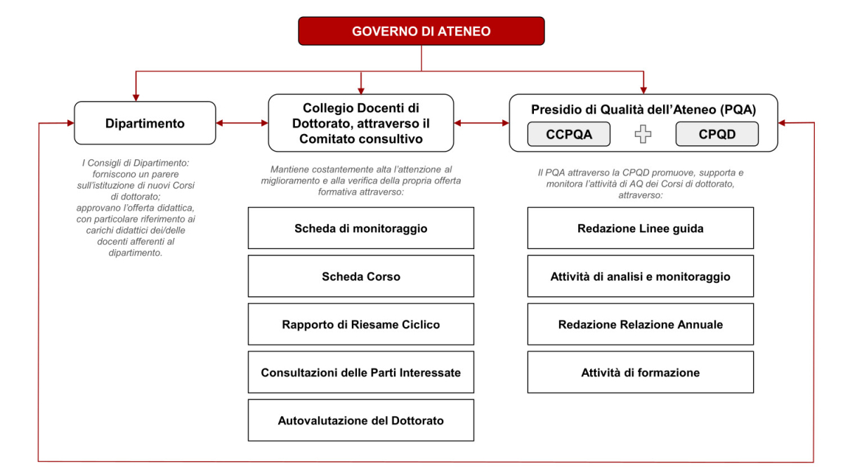 In questa prospettiva, ogni Corso di Dottorato adotta procedure trasparenti di definizione degli obiettivi formativi e dei profili in uscita, pianifica e organizza attività didattiche e di ricerca adeguate e coerenti con la propria missione, monitora i risultati conseguiti e attua interventi di miglioramento basati su evidenze. Il coinvolgimento attivo dei dottorandi, dei docenti e del Collegio dei Docenti rappresenta un elemento essenziale del ciclo di AQ, insieme al dialogo continuo con il Presidio della Qualità di Ateneo, con il Nucleo di Valutazione e con gli organi istituzionali competenti.