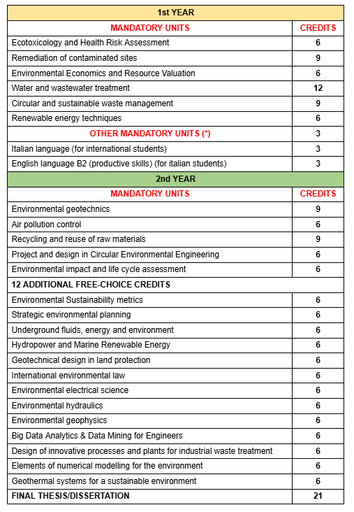 - 18 credits are selectable from courses already included in the two curricula of the Master in Environmental Engineering,