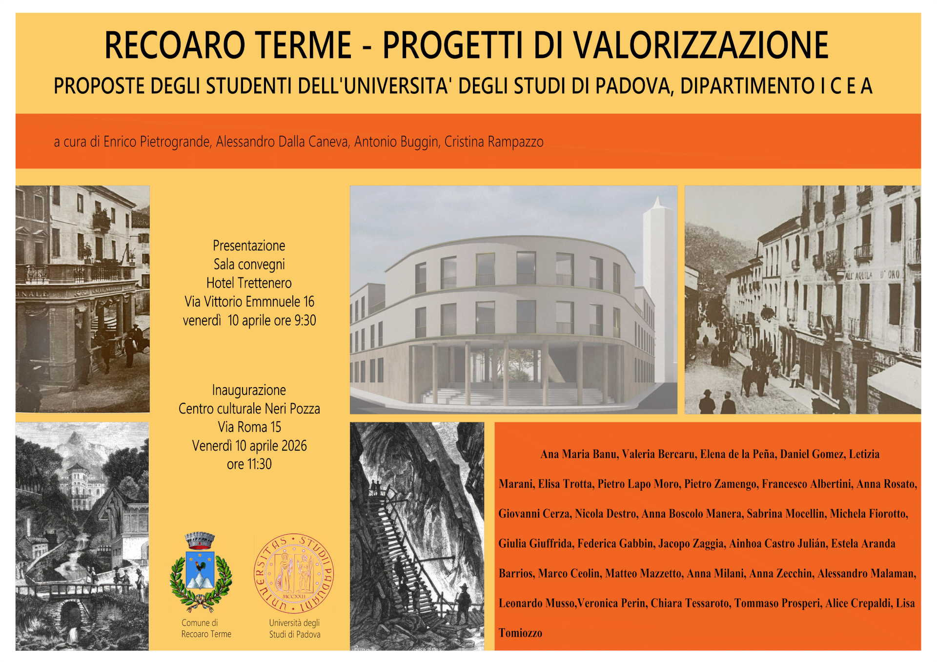 Venerdì 10 aprile alle ore 9.30 nella Sala convegni dell’Hotel Trettenero a Recoaro Terme sarà presentato un volume dedicato allo studio e all’approfondimento di alcuni luoghi che appartengono al territorio dello stesso Comune di Recoaro Terme. Sono presentate nel volume le proposte progettuali di valorizzazione elaborate dagli studenti del DICEA nell’ambito dell’insegnamento ‘Architettura della città’ (IV anno del corso di laurea in Ingegneria Civile – Architettura, docenti proff. Enrico Pietrogrande e Alessandro Dalla Caneva) nell’a.a. 2023-2024. Nel Centro Culturale Neri Pozza sarà poi inaugurata una piccola mostra incentrata sul tema e sarà distribuito il volume catalogo dell’esposizione.