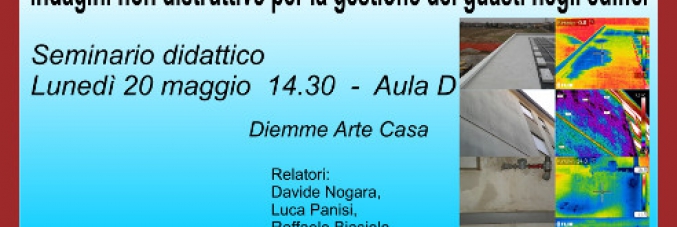 Lunedì prossimo 20 maggio alle ore 14.30 in aula D, nell'ambito delle attività programmate per il corso di Recupero e Conservazione degli edifici, si terrà un Seminario tecnico/didattico sul seguente argomento: “Indagini non distruttive per la gestione dei guasti negli edifici”.