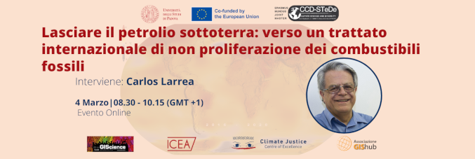 L' evento si terrà in presenza (presso l'aula R del Dip. ICEA, Via Marzolo 9) ed online il 04 marzo dalle 08.30 alle 10.15 e sarà in lingua inglese e simultaneamente tradotto in italiano. L'evento è aperto a studentesse e studenti dell'Università di Padova ma anche cittadine e cittadini che vogliono approfondire i temi della crisi climatica e dell'imperativo phase-out dai combustibili fossili verso un transizione equa e giusta.