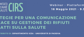 Webinar: 18 maggio dalle ore 9.30 alle 12.30Organizzato dal CIRS (Comitato Interdisciplinare Rifiuti e Salute) e dal Dipartimento ICEA dell'Università di Padova. La percezione del tema “rifiuti e salute” è fortemente influenzata dai contenuti e dalle modalità dell’attività di comunicazione.